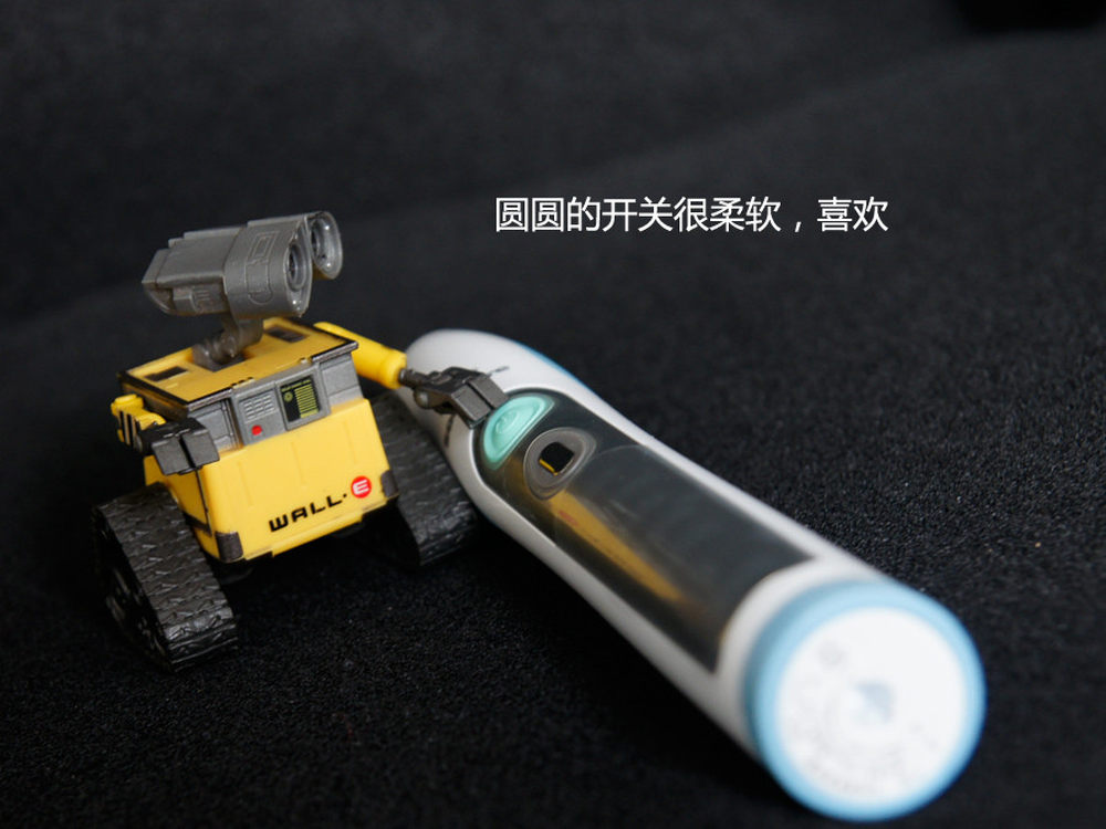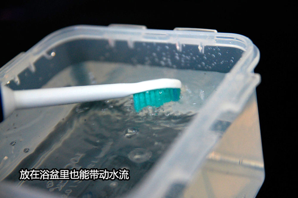 使用时应尽量让刷毛与牙齿成一定角度,通过在水池内测试,刷毛接触水面时泛起的波纹最大,而深入水底后自然微乎其微。我非常喜欢这种震动的设计,刷完牙清理刷头时只要放在杯中打开开关就行了,之后拿出杯子让它甩几下水也变没了,非常方便。16/23