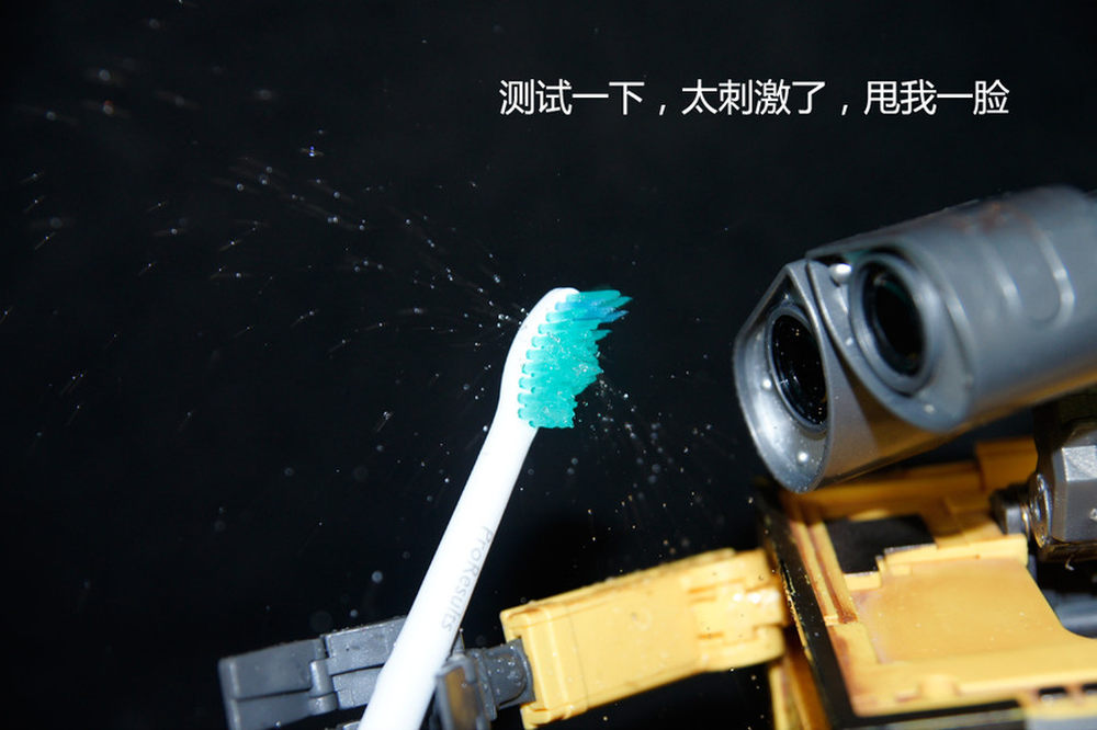 其实从图中就能够表述出Sonicare的高速震动,这张照片是在数十张1/250秒快门捕捉失败后诞生的,低速快门不足以捕捉水流的运动,即便是开闪也能看到水滴的轨迹,水流如此就更不要提牙刷头的震动频率了。15/23