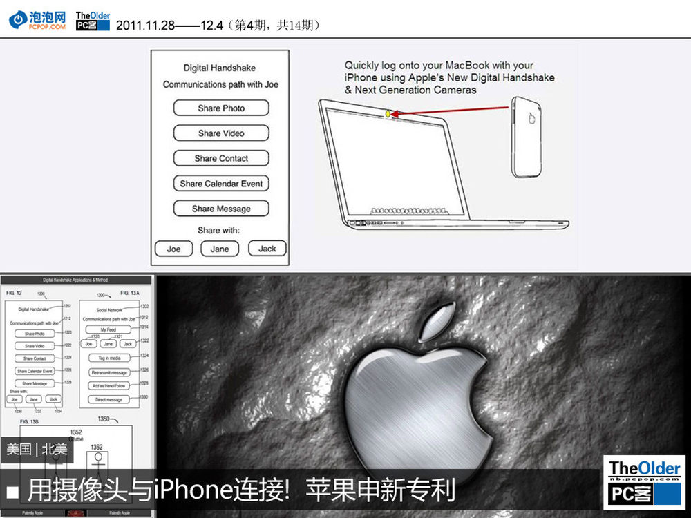据国外媒体报道,近日美国专利和商标局公布了一项苹果的最新专利。从专利描述来看,两款或多款苹果设备可通过摄像头来识别区分标记或屏幕上的图像内容,来创建连接并安全的传输数据。(详情请看:http://www.pcpop.com/doc/0/739/739801.shtml)10/11