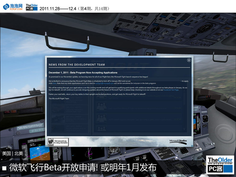 据国外媒体报道,微软飞行(Microsoft Flight)在12月1日正式开放了Beta测试申请。用户在填写部分信息后即可完成申请,等待审核。随后,微软飞行团队将对申请者进行一定的筛选。(申请通道参见:http://www.pcpop.com/doc/0/739/739730.shtml)