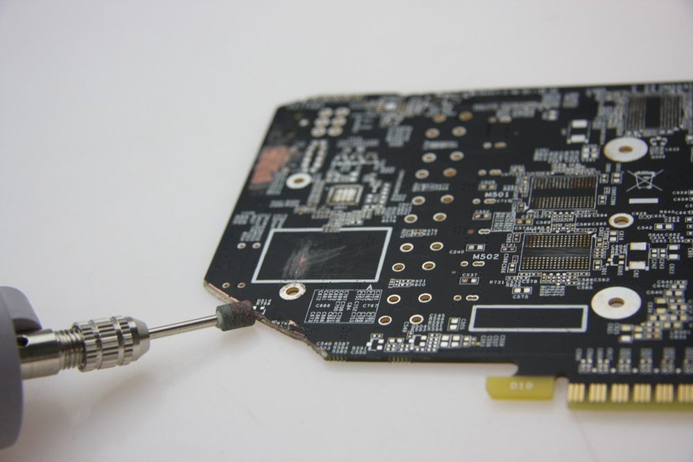 用砂轮打磨PCB表面,黑色的图层下面露出了黄灿灿的铜。5/11