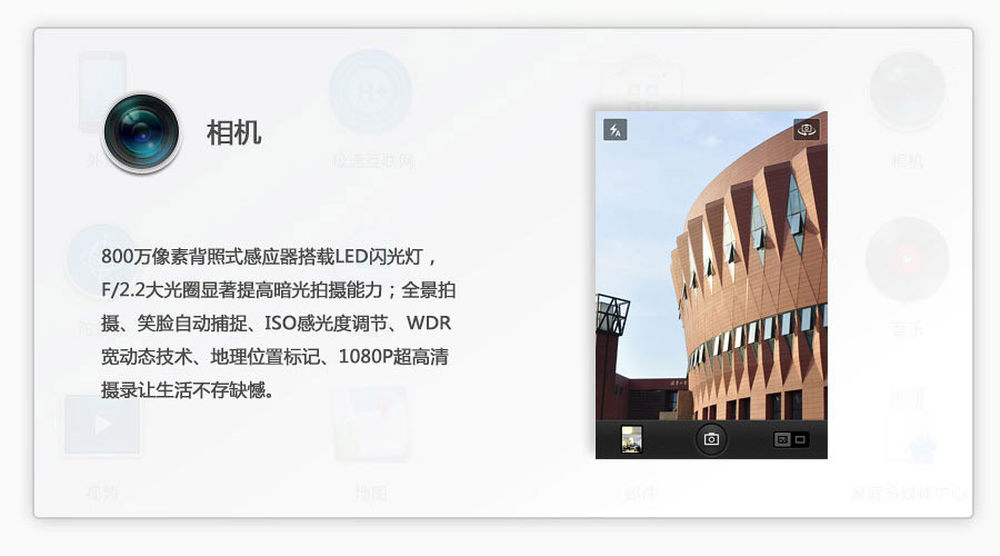 800万像素背照式感应器搭载LED闪光灯,F/2.2大光圈显著提高暗光拍摄能力;全景拍摄、笑脸自动捕捉、ISO感光度调节。12/19