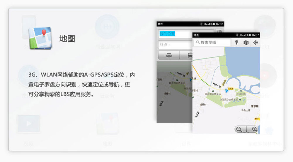3G、WLAN网络辅助的A-GPS/GPS定位,内置电子罗盘方向识别。