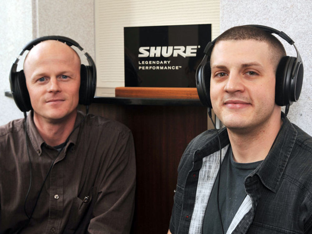 两个外国老男人在窃喜些什么呢?看看后面的LOGO就能得知他们对自家(SHURE)的新品相当有信心。5/8