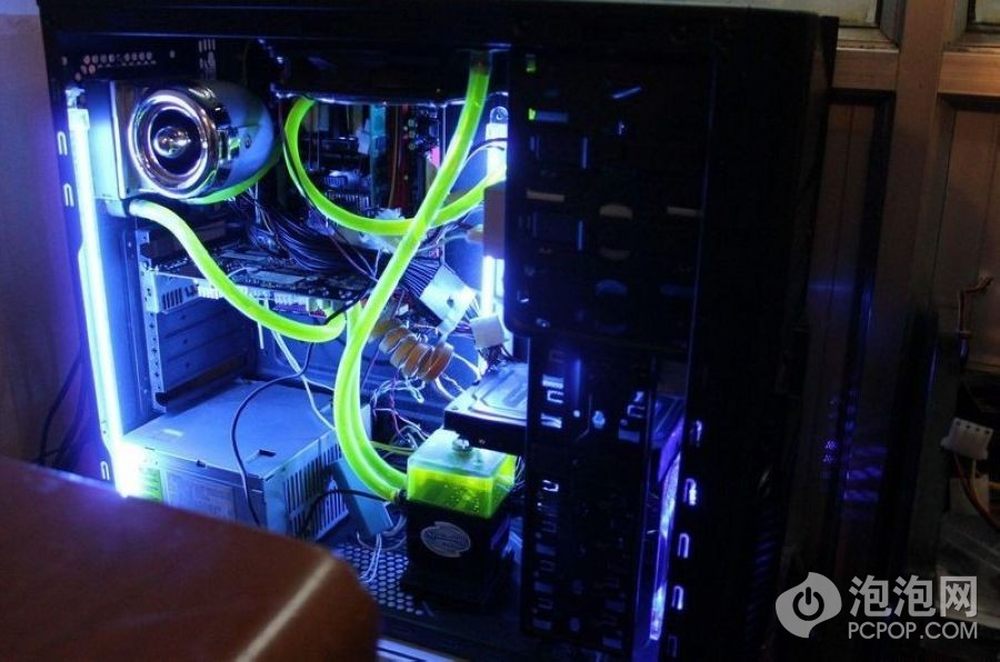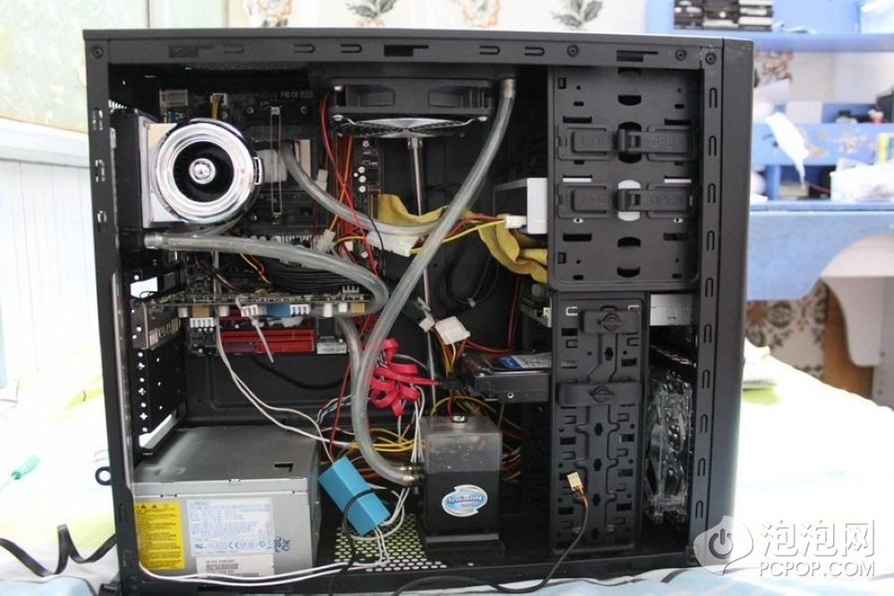 在水路设计方面,采用了水泵→主换热器→CPU→辅助换热器→水泵的水路方案。这个设计可以使水冷液经过CPU带走它的热量,在辅助排散掉。剩下的冷水给显卡散热,并流回水泵给水泵散热。显卡、水泵、CPU的一部分热量在水泵中的水箱混合后,流到主冷排散热。