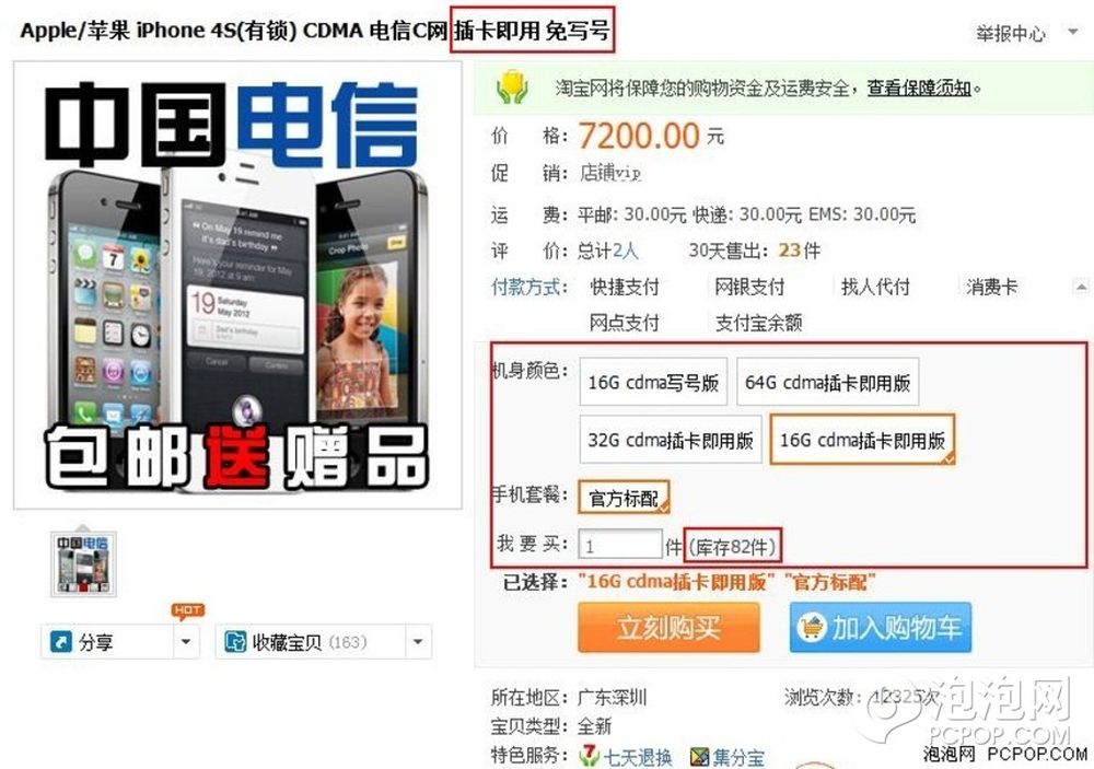 据相关媒体报道,近日淘宝出现支持插卡版的iPhone 4S,其中16GB CDMA插卡版机型要加7200元,顶配64GB版则高达8380元。从商家介绍来看,插卡版iPhone 4S拥有完整的iPhone功能,插卡即用。