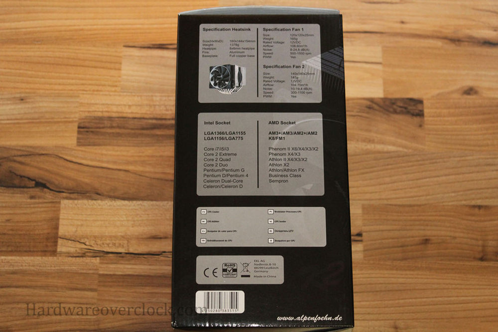 包装上印刷着大量散热器参数信息,包括风扇参数、散热片参数以及支持平台种类。从包装盒上就能知道它支持Intel平台下LGA775/1155/1156/1366/2011结构和AMD平台下AM2/AM2 /AM3/FM1等,涵盖了所有市售DIY处理器,也就是说你完全不用担心主板和CPU的兼容问题。3/21