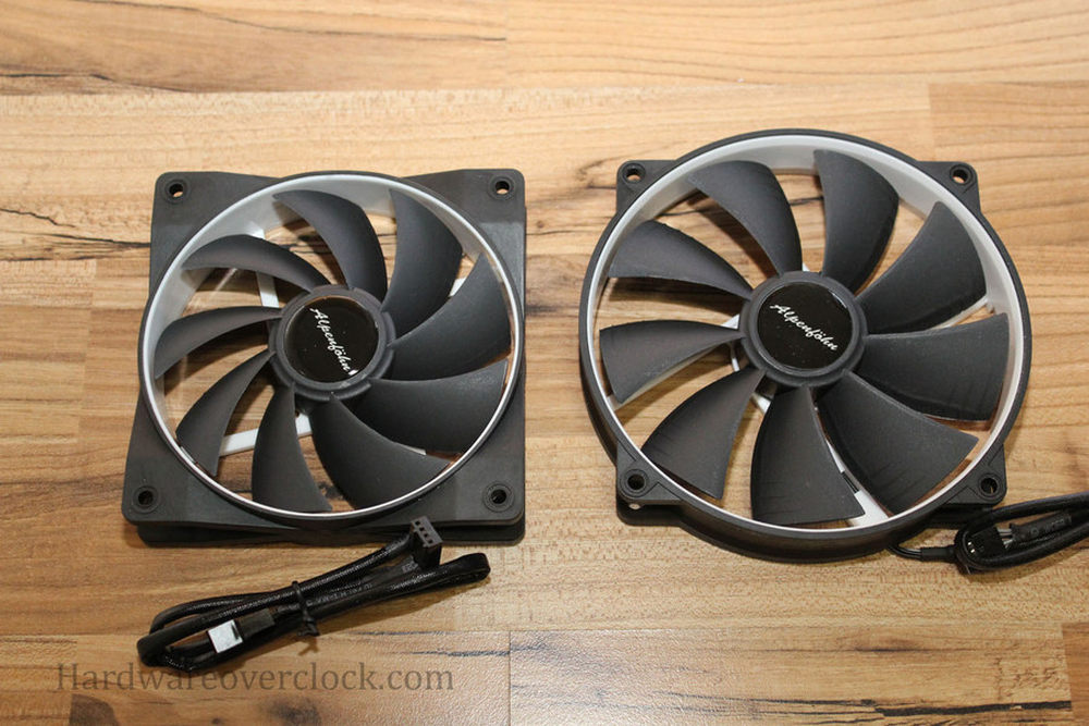 比较特殊的还是该散热器提供了两颗风扇,其中一个尺寸较大为140?140?25mm,重量为143g,转速从300到1100RPM,最大噪音不超过19.4dBA,非常安静。另外一颗尺寸为120?120?25mm,重量为165g,转速从500到1500RPM,最大噪音为24.6dBA亦可以接受。虽然12cm风扇尺寸小但是由于边框的设计重量要大一点,两款风扇提供的风量相似,大风扇转速低一点所以更静音。这两颗风扇均采用包胶技术处理,不需要在用减震软钉了,直接固定既有减震效果。6/21