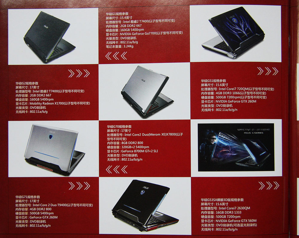 2011年6月,华硕发布最新一代ROG笔记本G53和G74,其中G53也是全球首款裸眼3D笔记本,这两款笔记本都支持WD无线视频传输,全部采用最新的SNB高性能平台。G53和G74的外形设计灵感源于隐形战机和跑车,内敛气质中又极具神秘感。26/30