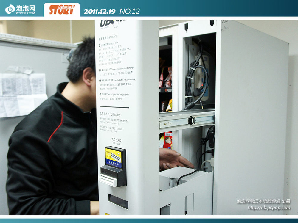售货机里面的结构还是不复杂的,左侧是货物存放,右侧是控制。说到控制就不得不说一下系统,这种UBOX售货机采用的都是LINUX操作系统,其实机器内部安装的就是一台电脑,图为工作人员正在拆卸内部的机箱。19/20