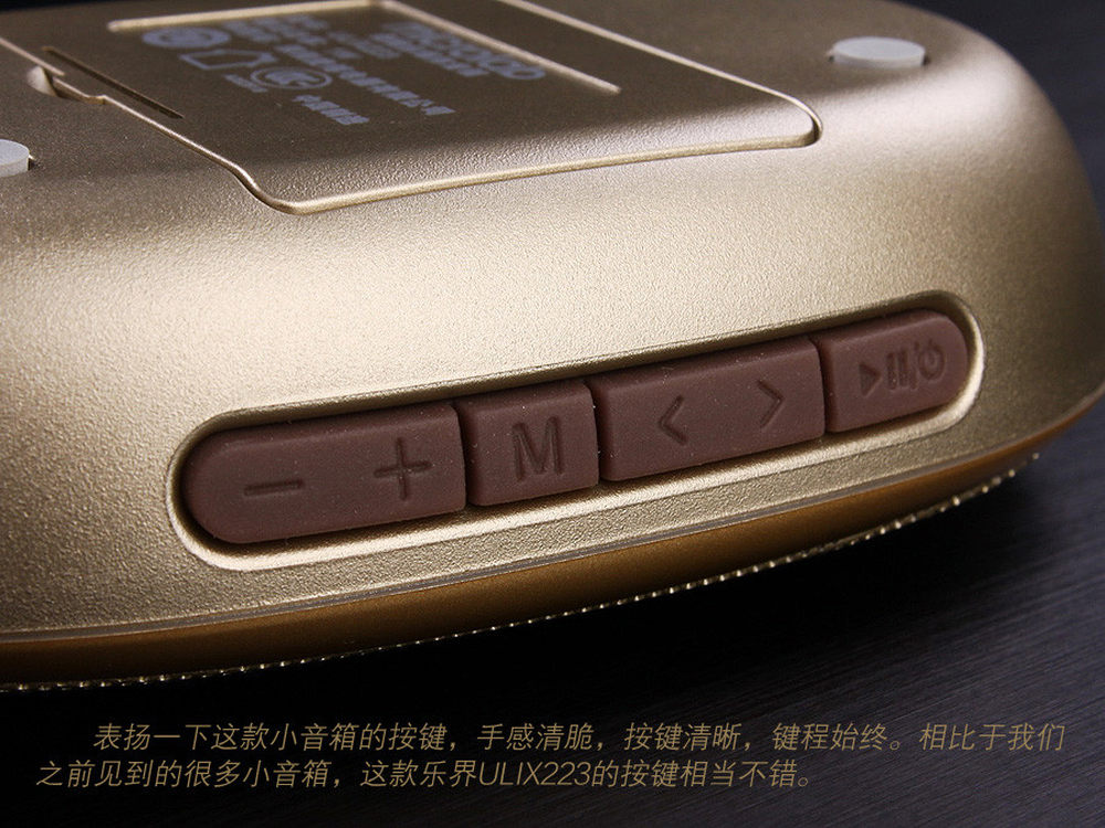 总的来说,新款的乐界表现还是给我们留下了较好的印象,尤其是这款金色的配色,更是让我们有了一种爱不释手的感觉。如果你正好需要一款这样的便携式小音箱,我想这款乐界ULIX223应当值得你好好考虑。