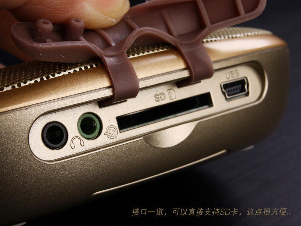 接口被设计在了机身的一侧,和操作按键相对应。音箱的存储采用了SD卡,相比于之前我们经常会见到的TF卡,SD卡显然更加容易找到,比如不特意去买卡,随便找一个相机淘汰下来的就行。TF则很多时候都要去买了。9/10