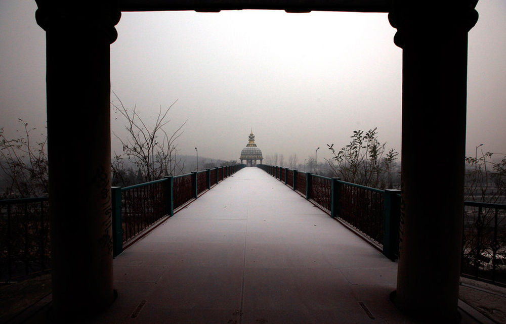 沃德兰乐园门口横跨京藏高速的天桥,刚刚下过的小雪留下了一串足迹。