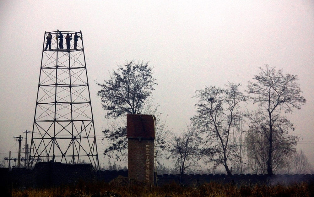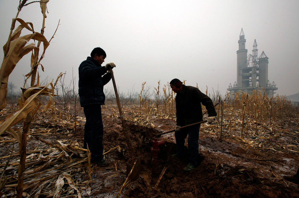 一位肩扛铁锹的农民,在田地里劳动,田地中的高塔是北京一个废弃的游乐场,名叫Wonderland,中文叫沃德兰乐园,位于昌平区陈庄村京藏高速旁。