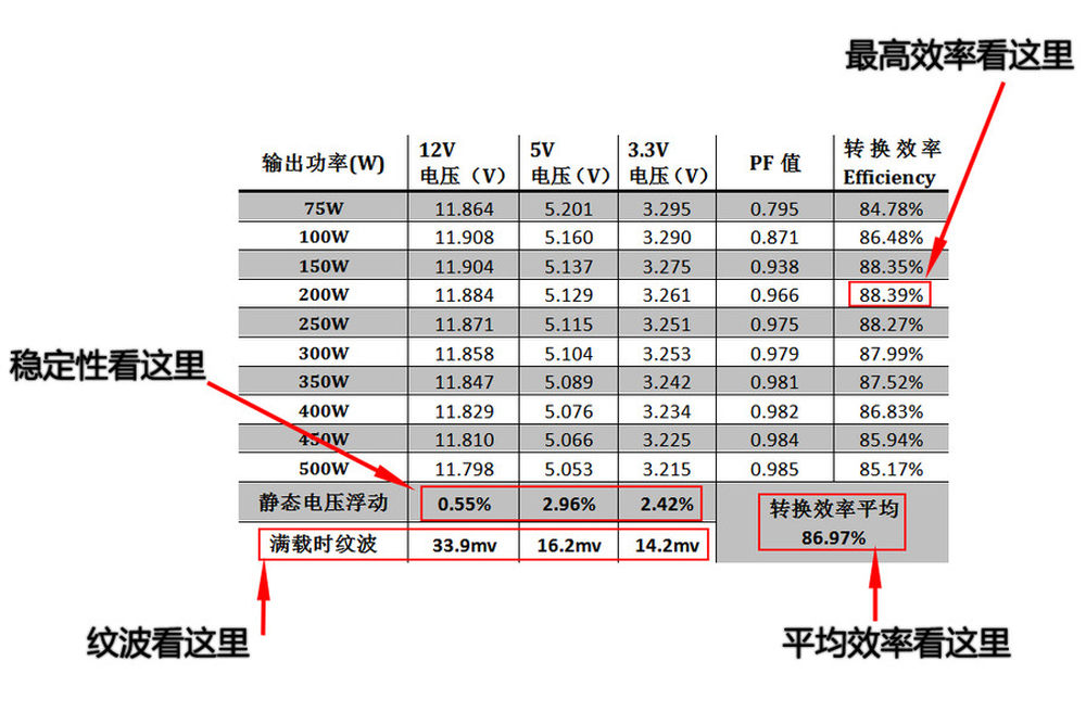红框内的部分是重点,除了转换效率是越高越好外,其他都是越低越好,我们从前也把每个负载点的电压用图表画出来,这样表示出来可能会直观一点,不过占用很多版面,而且单单列出一个电源的12V浮动值是2.32%%,即便用曲线画出来给你看,你觉得这种浮动值是好是坏呢?针对这个问题我们在后面给您更好地解决办法。4/14