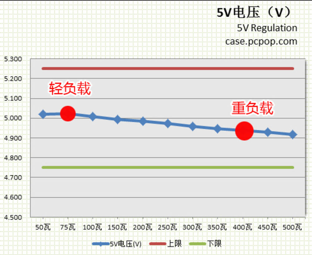 这种电压随负载加重产生变化的曲线我们已经不再使用了,刚才已经说过原因,各位还可以在其他网站看到这种方式,它的好处是在电源瓦数不足时,负载后期可以明显观察到电压下降速度加快。也可以更敏锐的发现整体电压偏低、偏高、或者超过电压规范的情况。