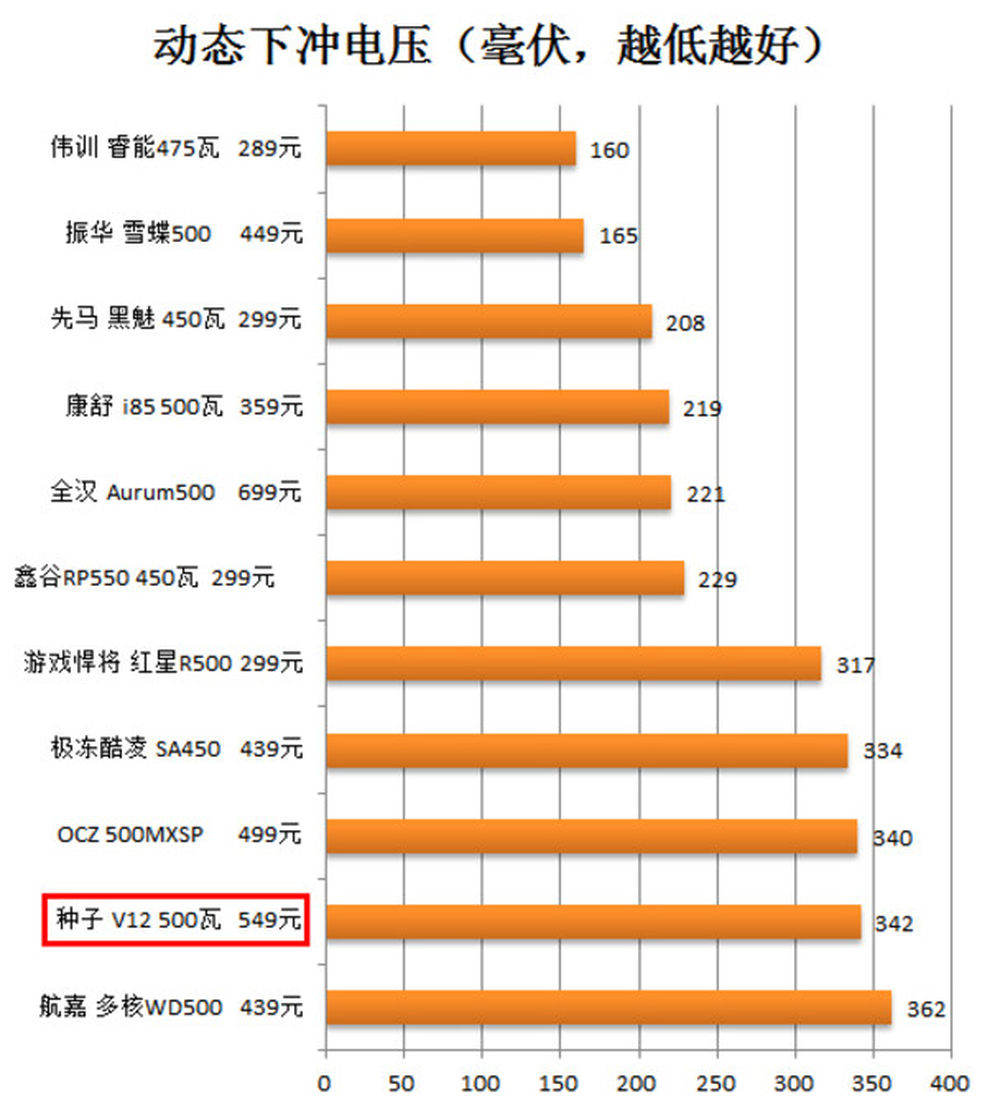 动态的情况好坏不是很专业的玩家可能就 更难看出来了,所以我们也在每篇单品电源评测中列出相近瓦数电源动态负载的表现情况,你可以看到某款电源动态性能在类似电源中是靠前还是落后。8/14
