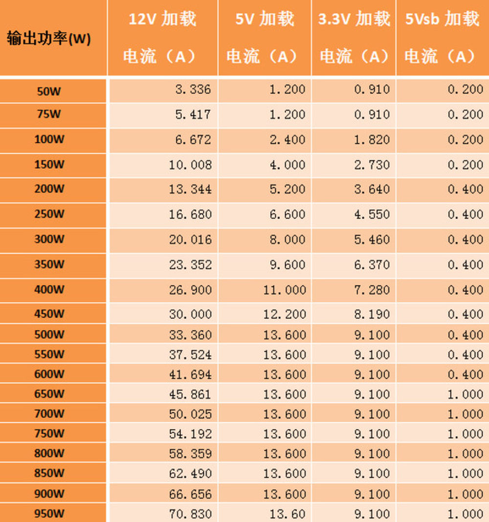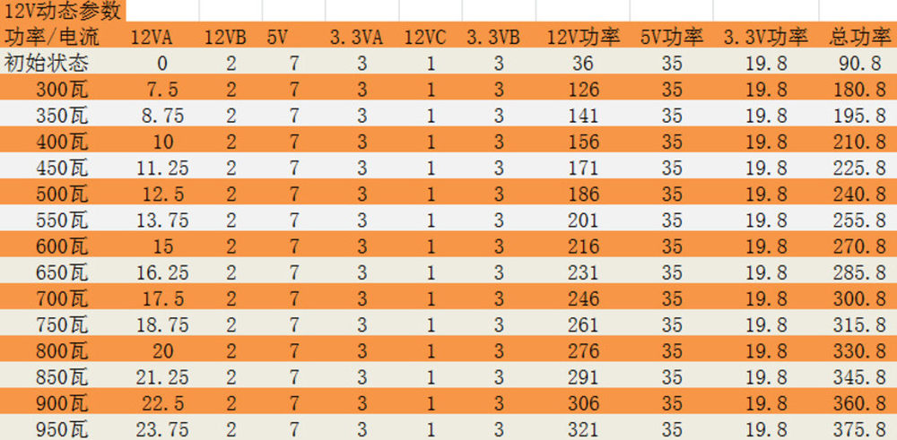 最后上传两张参数,第一张是静态负载下从50瓦-950瓦的负载分配,我们按照自己设备的限制做了一些调整,12V的负载比例略高于Intel ATX12V 2.31和EPS 2.92的内容。14/14