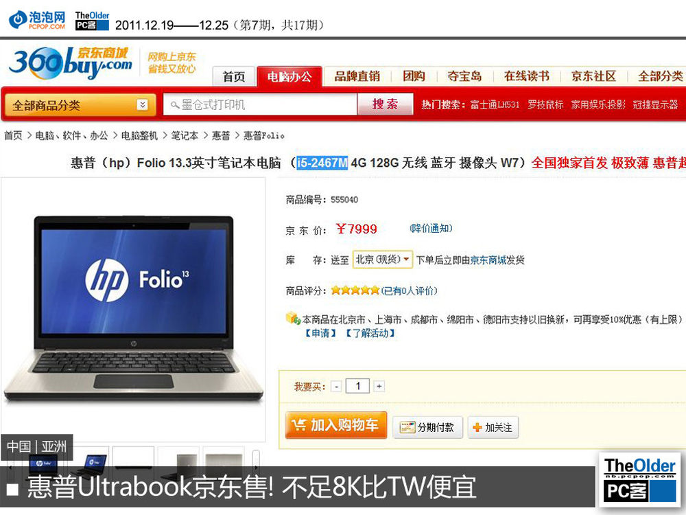 从京东商城获悉,惠普旗下Ultrabook超轻薄笔记本Folio 13已上架开售。据悉,此次在售机型搭载Intel酷睿i5处理器,并配以128GB SSD,售价为7999元,相比台湾同款机型的41900元新台币(折合约8764元人民币)的售价更为便宜。(了解产品具体规格:http://www.pcpop.com/doc/0/745/745773.shtml)7/14