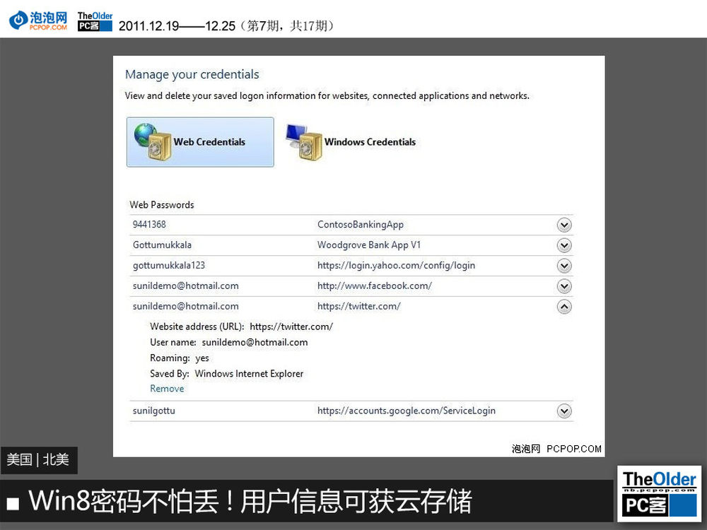据国外媒体报道,Windows 8将包含一个凭据管理器,将用户的身份认证信息保存在云上,使之更加安全地存储和管理Web和Windows用户凭据。从相关信息来看,Windows 8可以让用户创建和存储密码,并使其同步到任何其它收信人的Windows 8机器上。据悉,用户需拥有一个有效的Windows Live ID,其密码得到同步后,在一台新的计算机上用户即可随时随地获得自己的网站密码。12/14