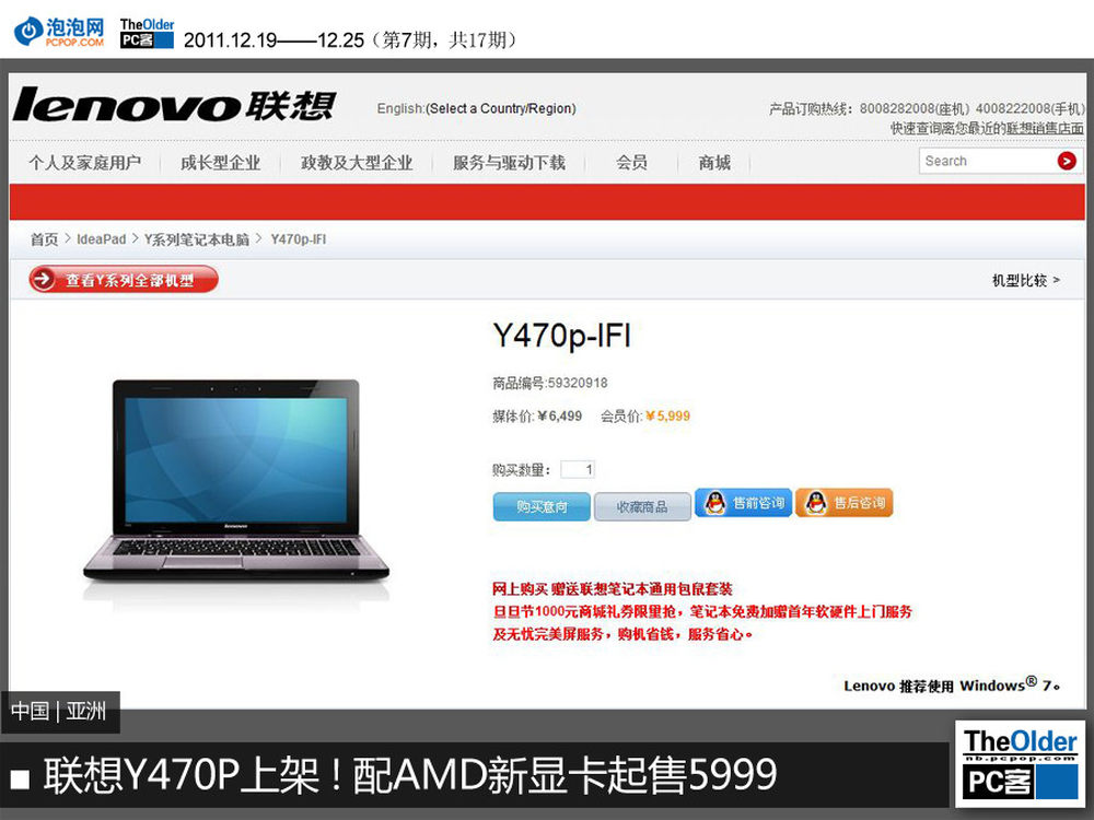 从联想官网获悉,目前联想Y470P新品已在联想官方商城上架,搭载Intel Sandy Bridge酷睿i5/i7处理器,更标配AMD最新7系列独立显卡,商城会员起售价5999元。(了解产品详情:http://www.pcpop.com/doc/0/747/747986.shtml)13/14