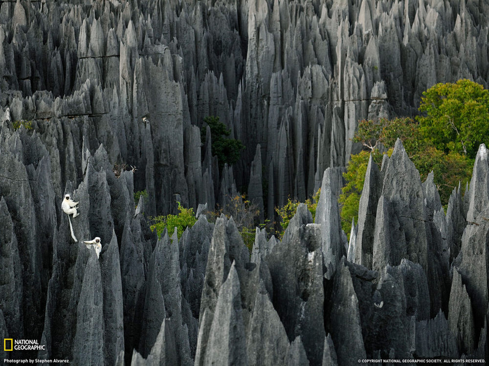 【马达加斯加狐猴】生活在马达加斯加西部岩溶的马达加斯加狐猴。这些狐猴居住的不同寻常的尖峰从180万年前开始由地下水溶解多孔石灰岩而逐渐形成。——摄影师:Stephen Alvarez