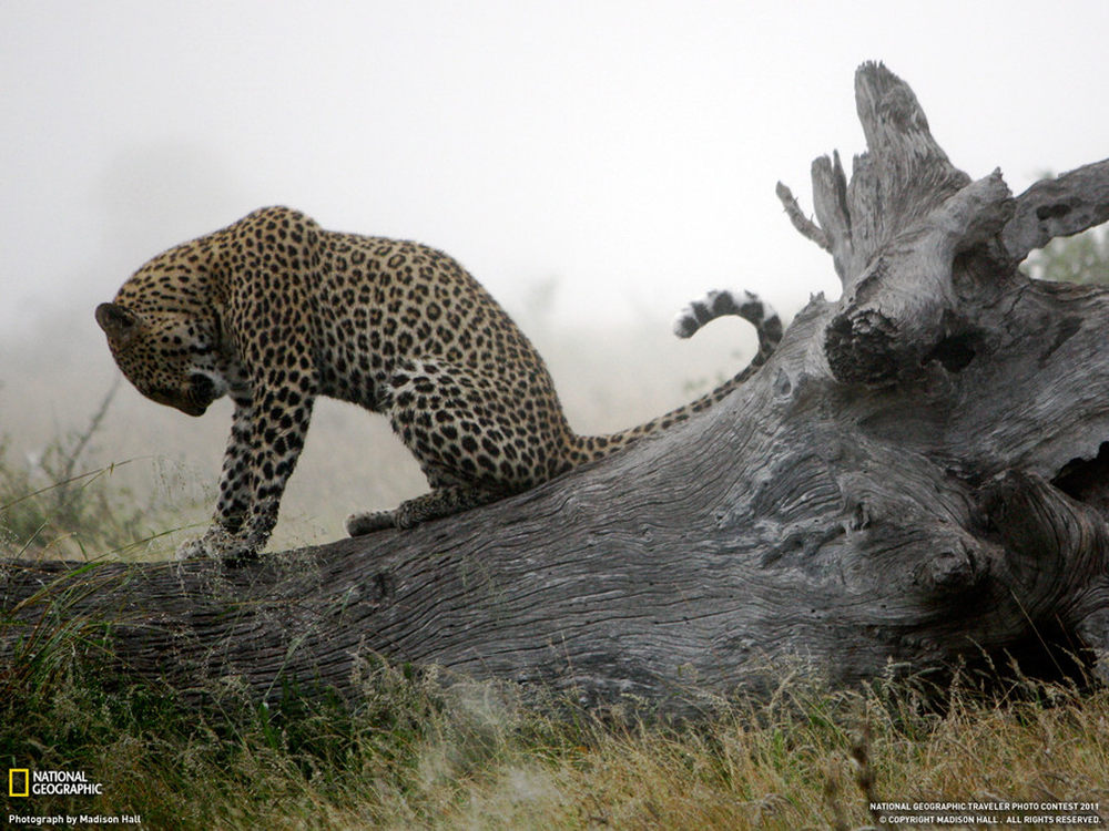 【南非的非洲豹】早上,一只正在进行“露水浴”的年轻的非洲豹平静的站在一棵倒下的树上。非洲豹异常机警,又习惯于夜间狩猎,因此追踪他们的足迹非常困难。由于美洲豹和其他顶级食肉动物的健壮和华丽非凡的皮毛,往往成为人类狩猎的目标,导致他们的数量急剧下降。——摄影师:Madison Hall