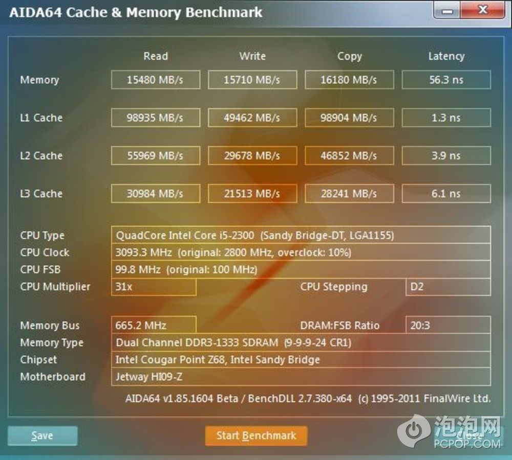 AIDA64测试如下,写入15710MB/s,读取16180MB/s,延迟56.3ns。7/8