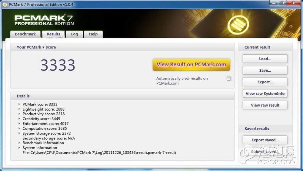 PCMARK测试成绩如上,总成绩3333分。