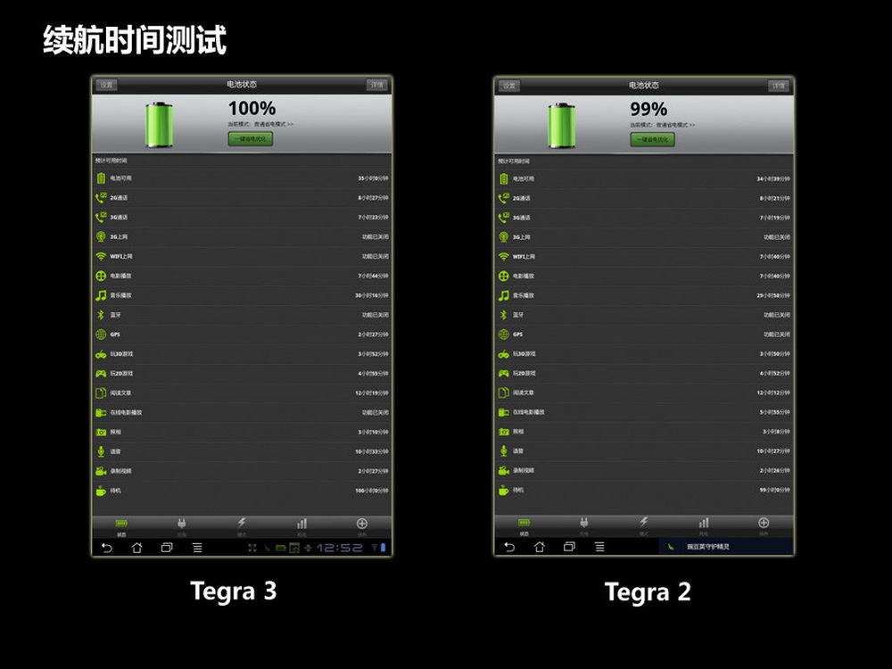 Tegra 3可在不同使用情况下开启不同数量的核心,所以在能耗方面更具有优势。不过目前Tegra 3在Android3.2系统上的优化还不完全,所以通过软件的测试结果基本相同。不过从实际的使用上来说,华硕Transformer Prime的续航能力要比TF101强出不少。5/14
