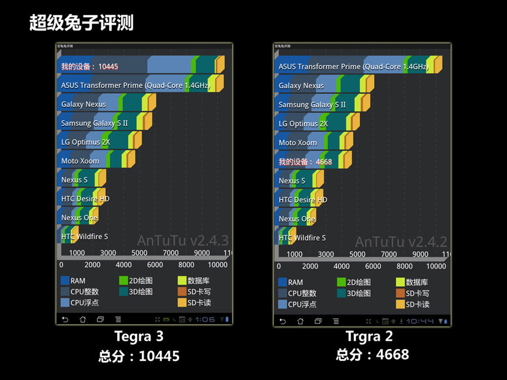 在超级兔子的测试得分,Tegra 3高居榜首,总分为10445分,而Tegra 2只有它不到一半的4668分,可以直观的看出Tegra 3为产品带来的提升直接翻倍了。7/14