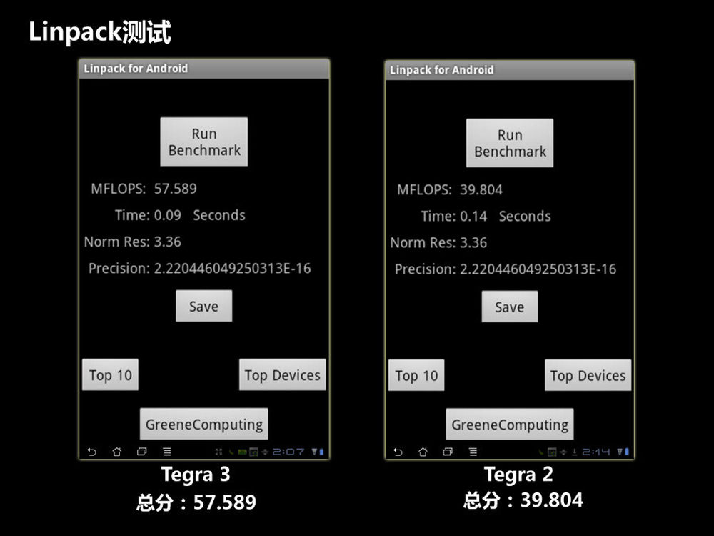 Linpack是目前最流行的用于测试浮点性能的专业软件,主要反映了CPU的运算能力,Tegra 3的得分要比Tegra 2高出不少,可见运算能力上四核处理器的优势尽显。8/14