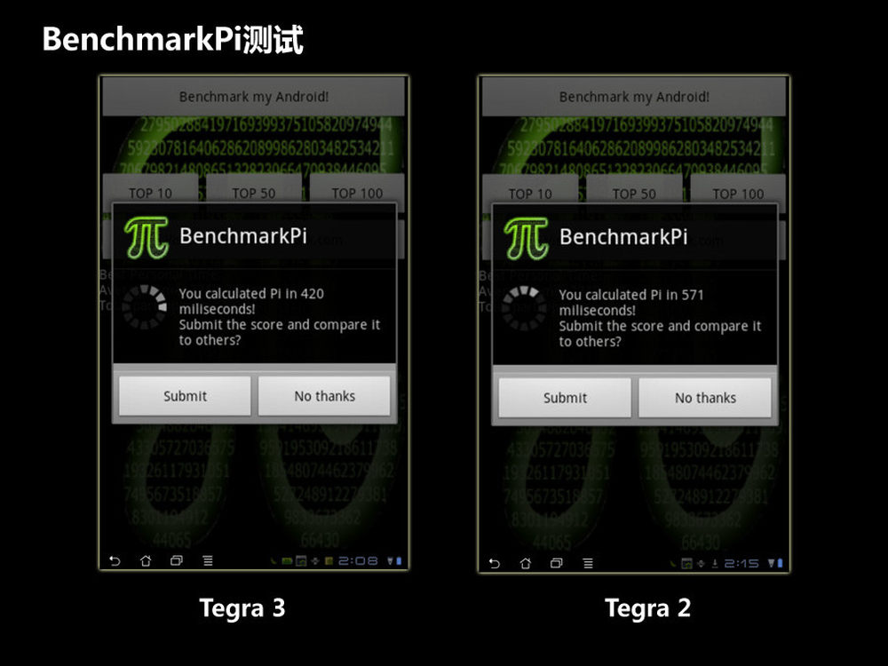 Benchmark Pi是一款测试CPU相应速度的软件,这回是数越小性能越好,Tegra 3同样轻松胜出,看来Tegra 2的双核处理器在Tegra 3面前很难抬起头啊。9/14