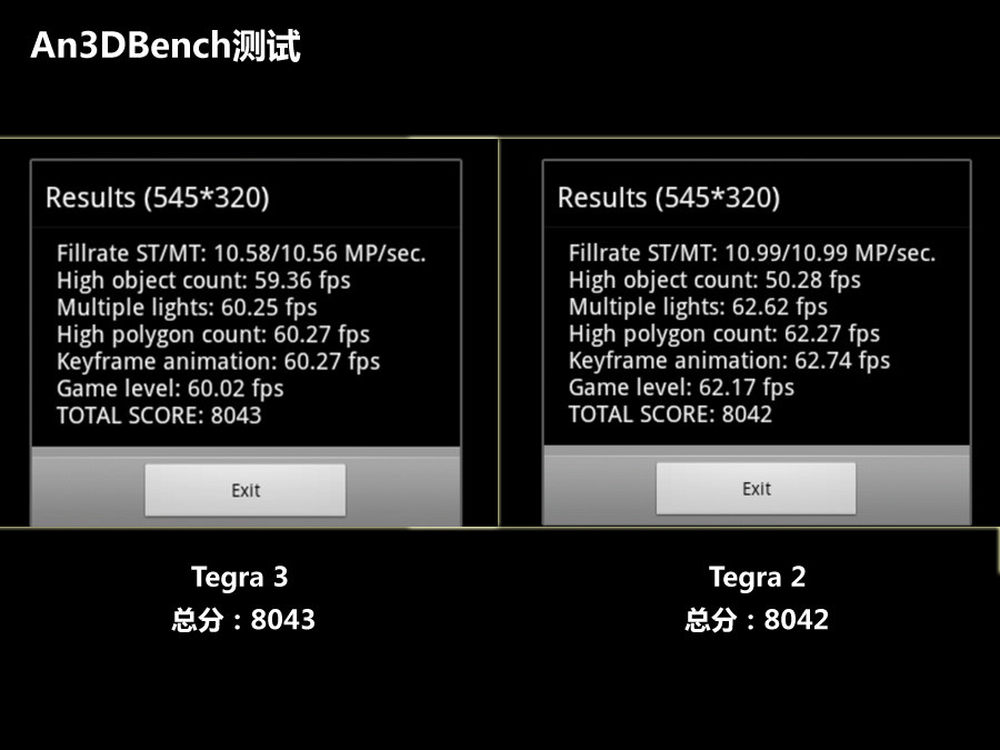 接下来就是图形处理能力的测试,An3DBench通过进行分辨率、光影效果等多方面综合测试评定产品的图形处理能力,而我们也发现两者的得分基本相同,并没有反映出差距,笔者认为其中的原因应该是Android3.2系统并没有针对Tegra 3四核处理器做出任何优化所致。10/14