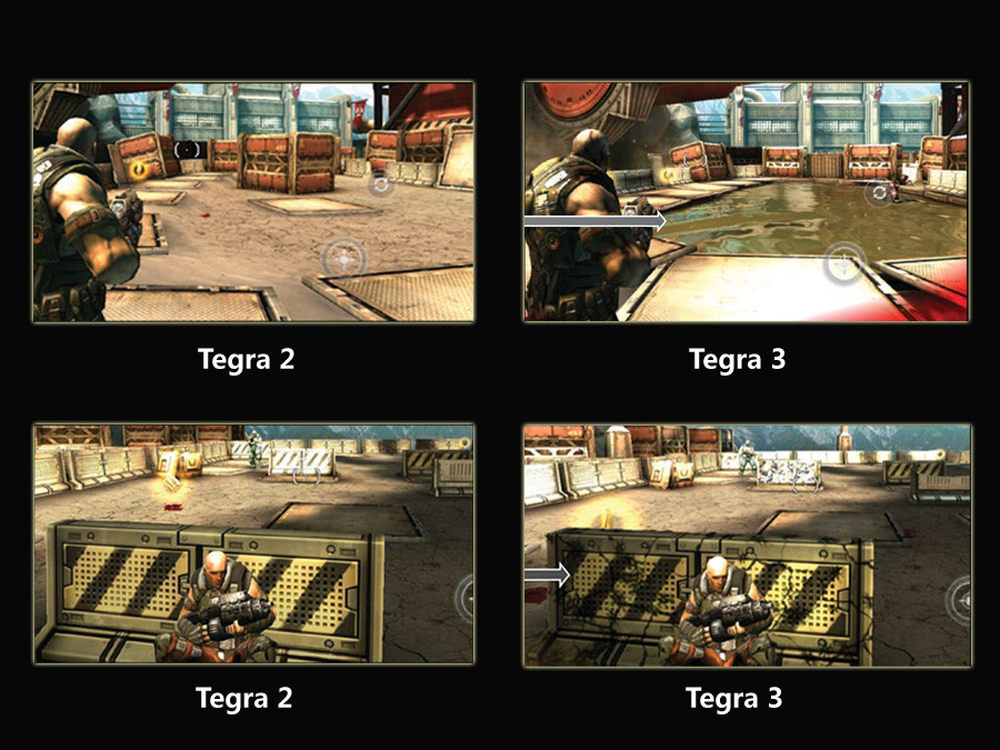 下面再来看一看《暗影神枪》游戏的对比,我们就从官方给出的游戏画面中找寻不同。上方画面中,使用Tegra 3处理器的画面明显增加了水纹的特效,显得更加真实;而在下方的画面中,使用Tegra 3处理器的画面则有裂纹的特效,这点在使用Tegra 2处理器的画面中则完全没有体现。14/14
