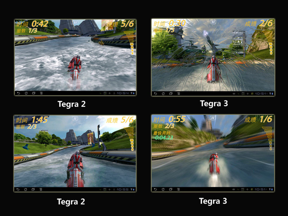 高性能的Tegra 3四核处理器在游戏特效的处理上有着非常明显的优势,这点在这张《激流快艇》游戏画面的对比图中更是显而易见。在游戏过程中的加速动态模糊和水花喷溅的特效只有在Tegra 3中还能体现出来,而在Tegra 2中则玩不出这种效果。13/14