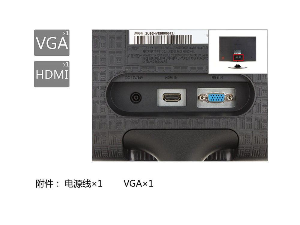 采用外置电源,背部具有VGA和HDMI接口。5/12