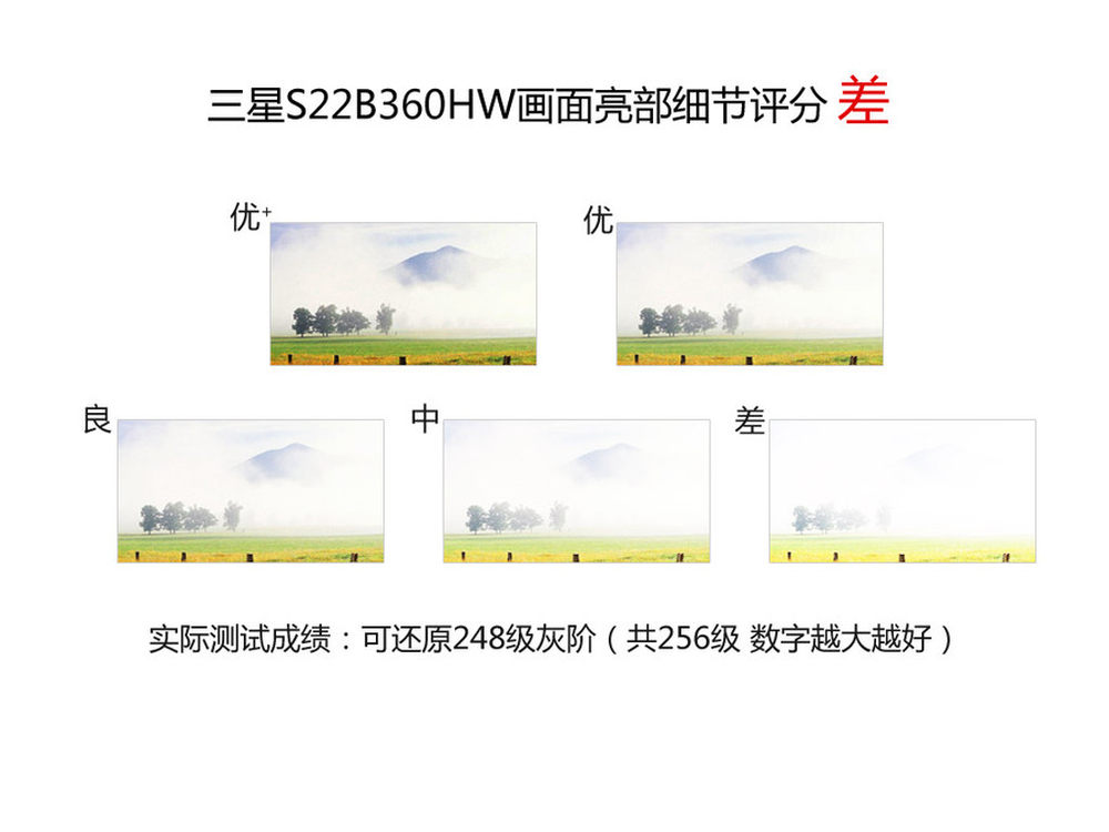 三星S22B360HW的亮部细节能够还原到第248级灰阶,如果说这款液晶唯一的不足,那或许就是亮部细节还原了。9/12