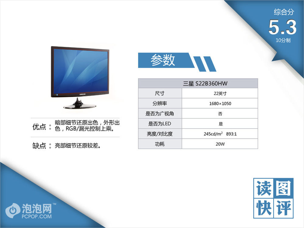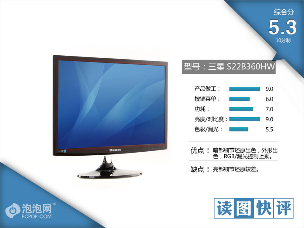 三星S22B360HW的三原色和暗部细节还原能力都相当强悍,漏光控制和外形方面也都非常让人满意。不过其亮部细节需要提升,对比度略低。但坦诚而言,这款新品TN依然凭借着优异的外观,HDMI接口将会有广阔的市场。