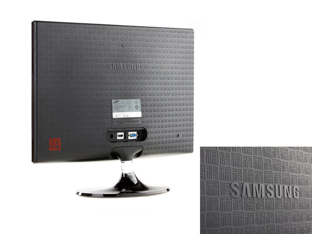 首先三星的福韵B360系列采用少见的16:10比例,标准22吋宽屏,自然分辨率是1680*1050.产品在外形上的优势非常明显,最主要的就是背部的无数“福”字。3/12