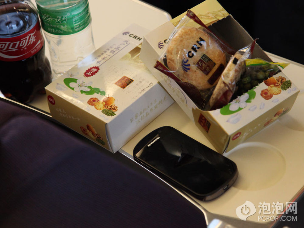 溜达一圈回来后偶遇一美女乘务员,原来坐高铁还可以免费获得饮料及小吃,这服务真不错。7/45