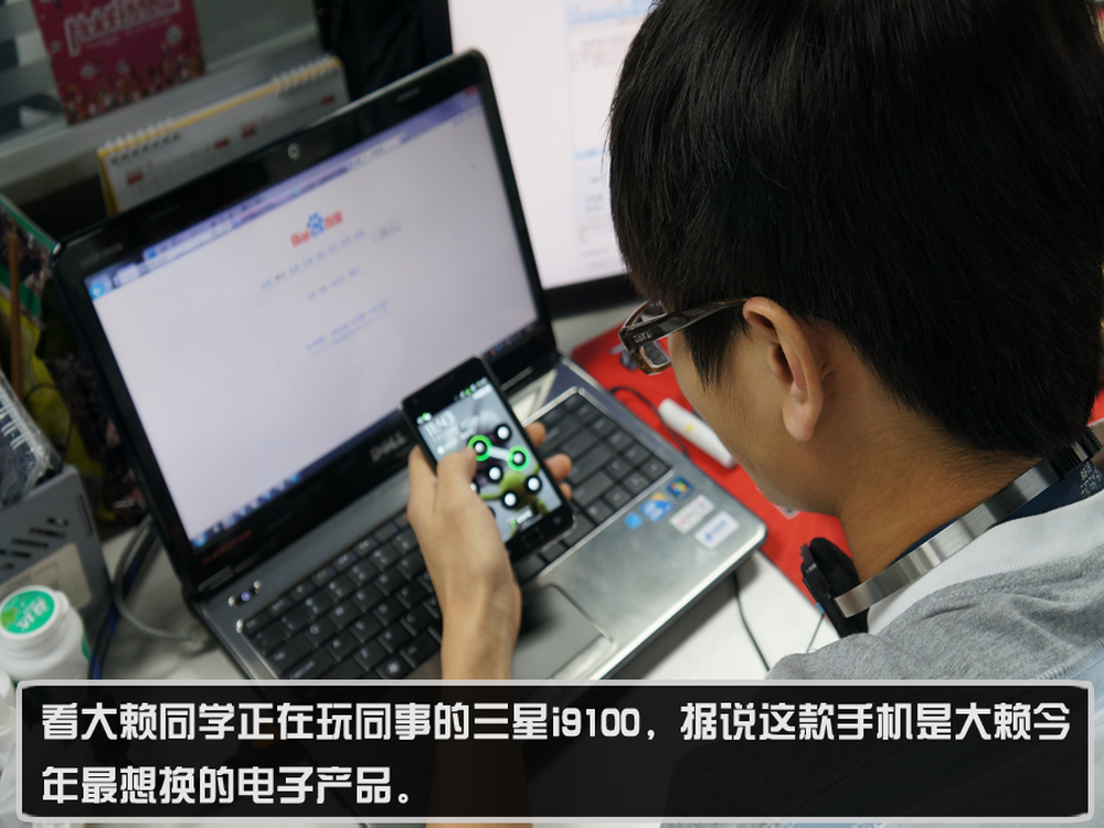 看大赖同学正在玩同事的三星i9100,据说这款手机是大赖同学今年最想买的电子产品。5/18