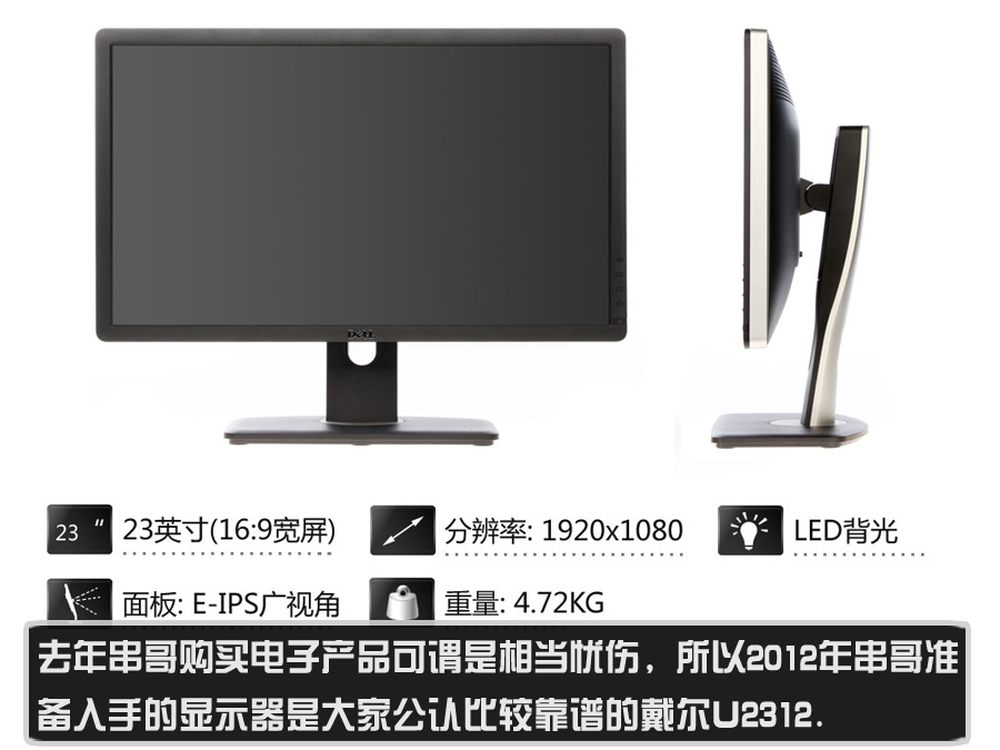 戴尔U2312采用了23英寸E-IPS广角面板,最大分辨率高达1920x1080,呈现出分毫毕现的清晰画质;采用82%%(典型值)宽广色域,令色彩更加艳丽,层次表现丰富;升级后的200万:1超高动态对比度将大大提升产品明暗细节的表现力,无论是应对高清电影还是大型游戏,都毫无压力。接口部分,U2312设置有支持HDCP的DVI-D、DisplayPort、D-Sub,以及USB 2.0 Hub接口,能够轻松满足用户的各种接驳需求。4/18
