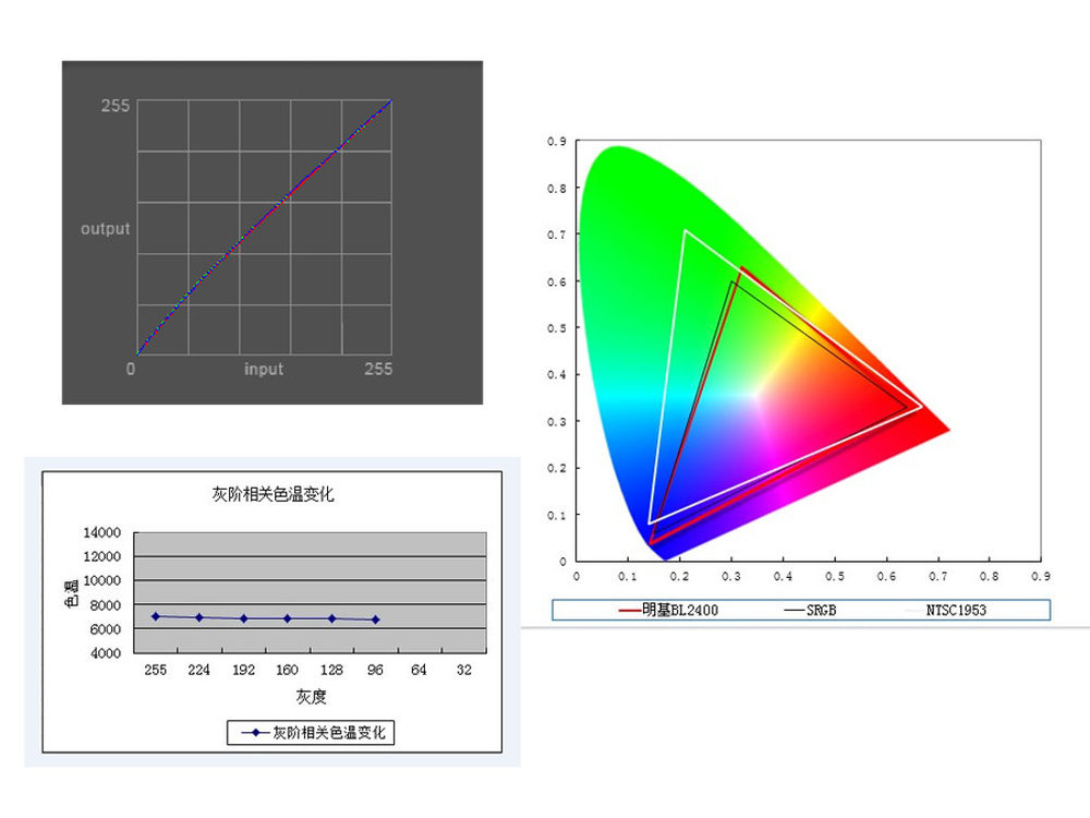 明基BL2400PT的gamma灰阶过度相当平滑,RGB三原色几乎完全重合于一条直线上(左上图)。而在色温的稳定性方面,不敢说完全水平,但是已经很接近水平线,这表明明基BL2400PT色温数值恒定,颜色显示也就更为准确(左下图)。同时我们看到它的NTSC色域范围之广,几乎完全囊括了srgb的范围。9/13