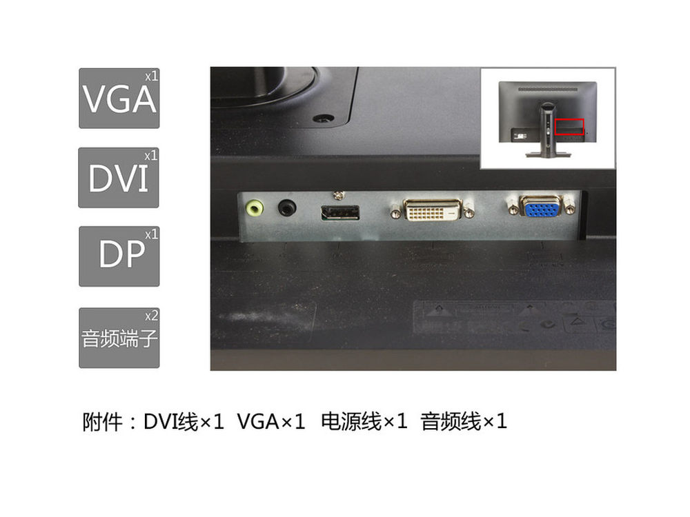 背部的接口方面,除了音频输入输出接口以外,它有必备的VGA接口,另外还有DVI和DisplayPort接口。6/13