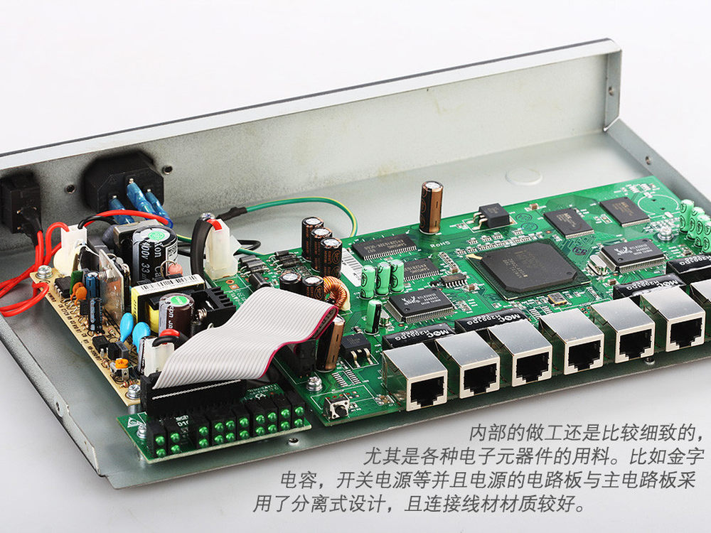 路由器内部,做工和用料都比较讲究,尤其引起我们注意的是它的电源部分。不过,如果能够在电源以及主线路板之间采用绝缘等隔离措施,相信会更加稳定。7/15