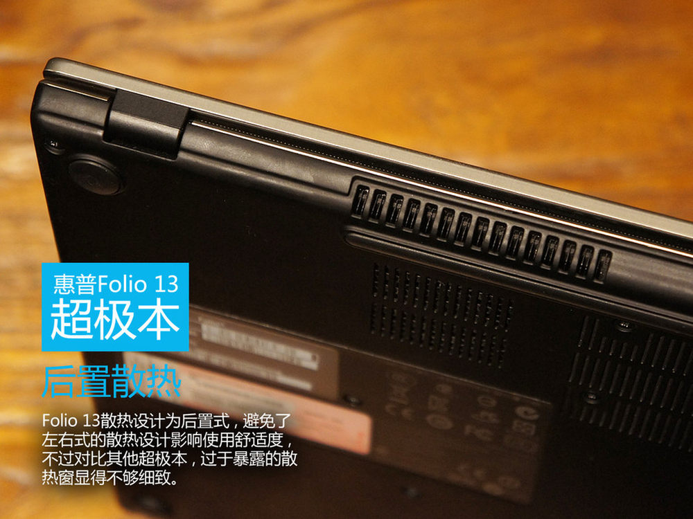 Folio 13散热方式为超极本常用的后置散热,不过过于裸露的散热窗或多或少影响了后端的简洁性。21/24