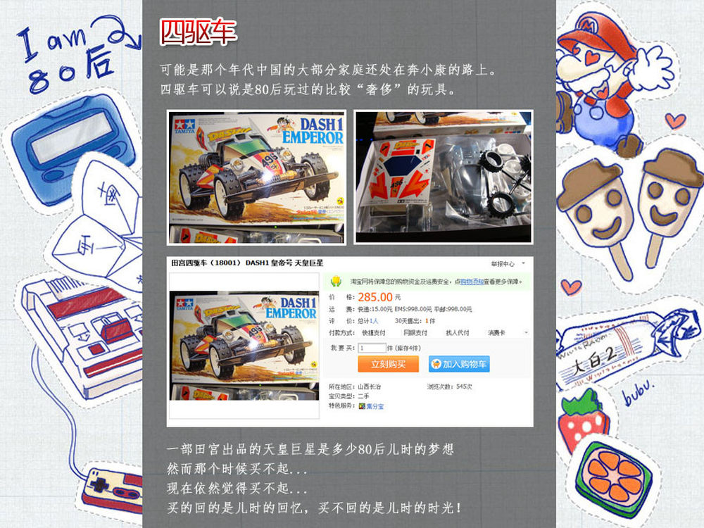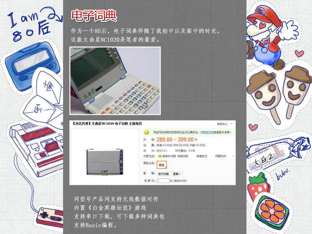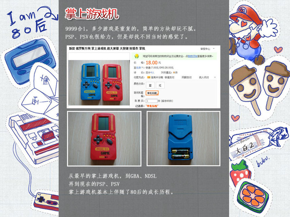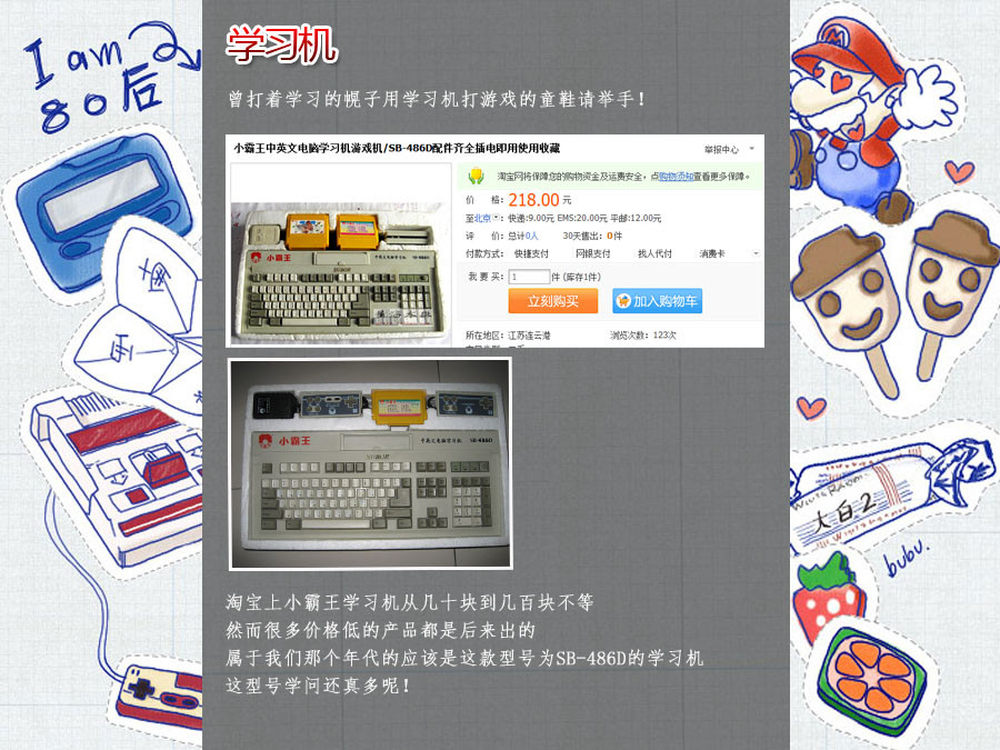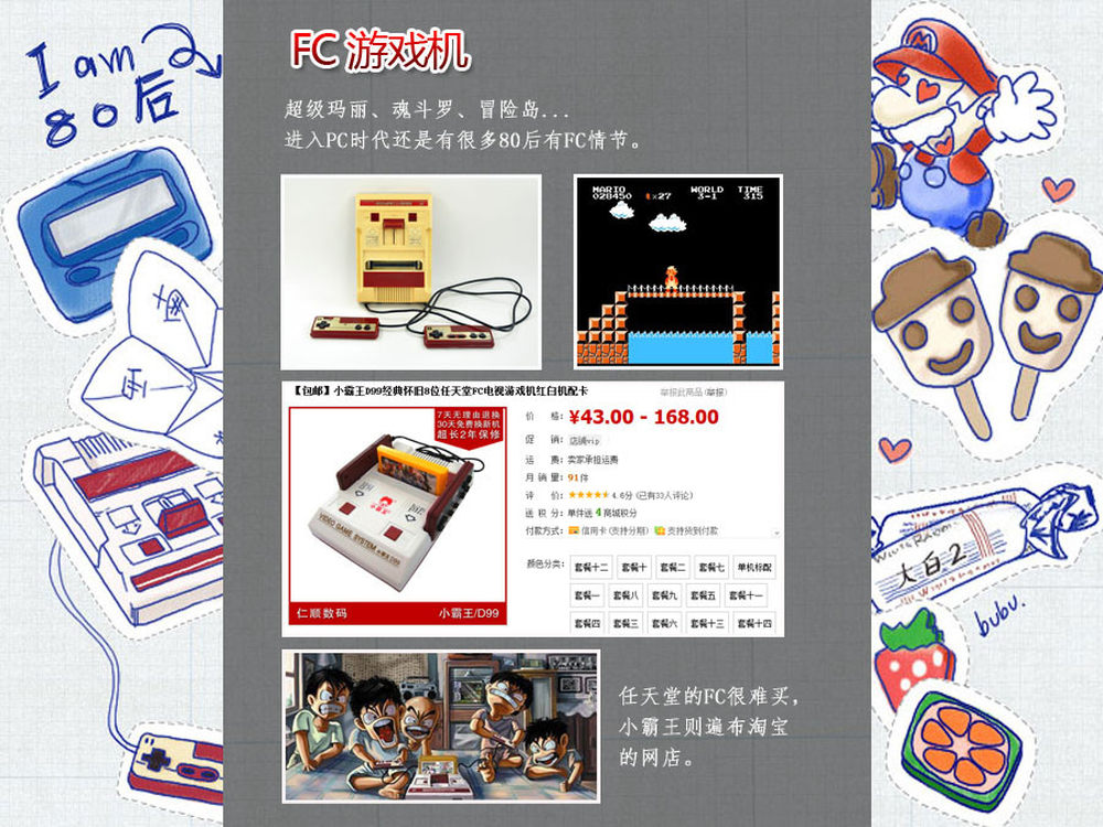 如今很多80、85后都已经走上了工作岗位,然而相信大部分80后与笔者一样,每每说起同年那些事,总有说不完的回忆。我们是幸福的一代,从小就能接触到电子游戏,丰富了我们的童年回忆。从FC到学习机、再到PC,很多人还有很浓重的FC情节,所以每每与同事玩FC模拟器游戏总是欢乐多多。那么,对于80后来说都有哪些产品是值得回忆和收藏的呢?下面笔者就为大家盘点一下!2/11