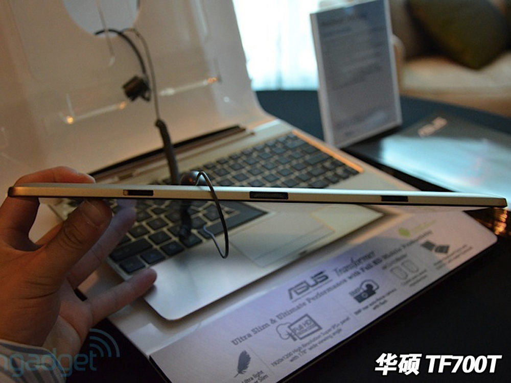 华硕Transformer Prime TF700T机身底部有一个专用DOCK接口,旁边拓展用的固定槽,可以和键盘底座连接,也可以做传输数据及充电使用,续航时间更加持久。