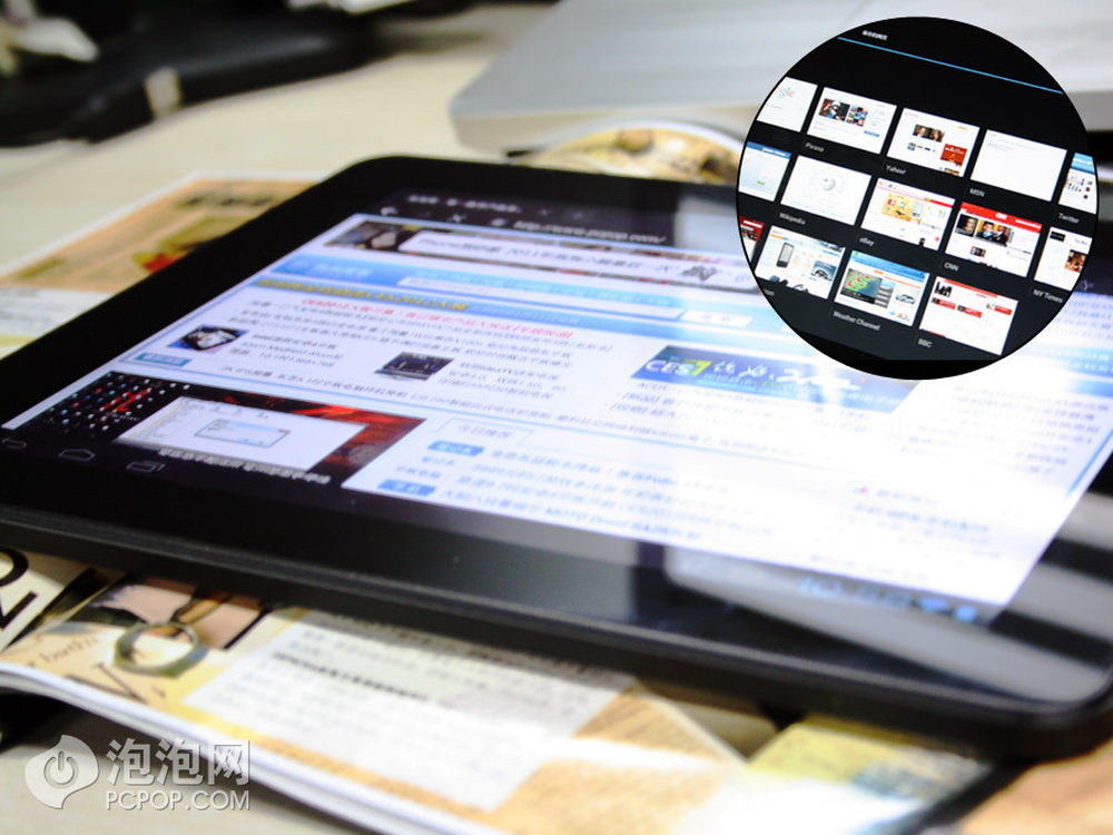 原道N90浏览网页暂时不支持FLASH显示,浏览器增加了多标签功能。值得一提的是,小角度拍摄显示网页的屏幕,原道N90 IPS屏幕没有明显偏色现象。9/14